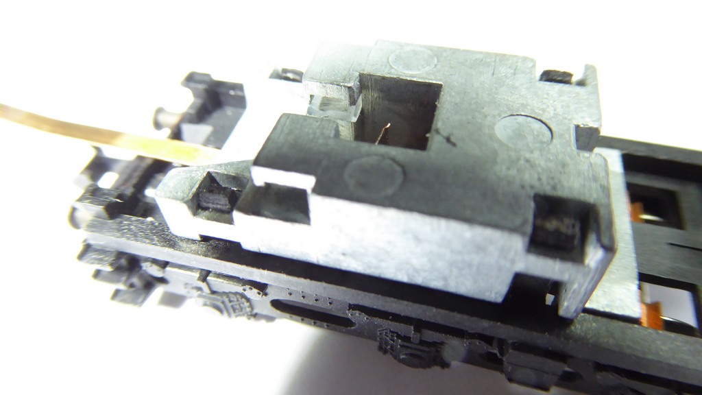 Put the weight in place to check the fit. Note the long strip sticking out at the rear. The stalks on latches have sprung back over the weight, keeping it held down. Note the snipped off strip in the square hole - for the positive rail pickup. Then take it off again..... |