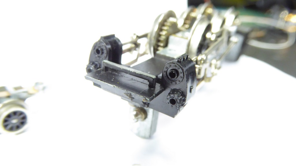 ....which is shown here on the upside down chassis. The top side of the metal bar (which is the bottom side on the upside down photo) has to be bare metal. The flat part of the chassis base under the bar in the photo should also be bare metal. Many later models had this painted for some unknown reason. Two of the main drive wheel have rubber tyres fitted and do not pick up the negative connection reliably. The loco relies on the two front bogie wheels on the left to provide better continuity. Difficult to clean off, but I found a scalpel is good for scraping to the bare metal, finished off with fine emery to make the surface smooth again. |