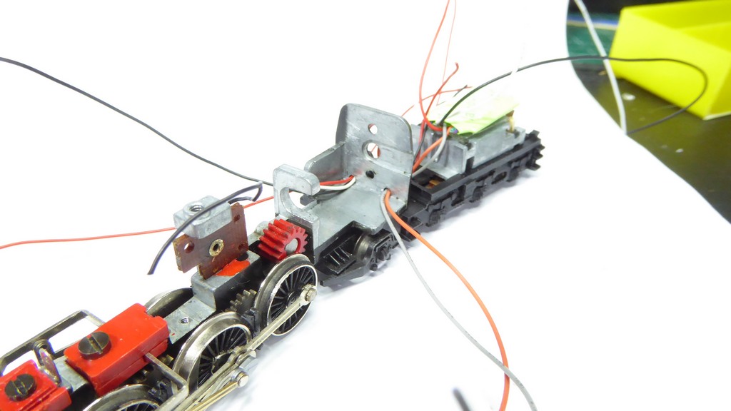 You can turn the loco over now. Thread the grey and orange wires from the chip through the hole on the left side of the loco. The loose red, black and white lengths go through the right side. |
