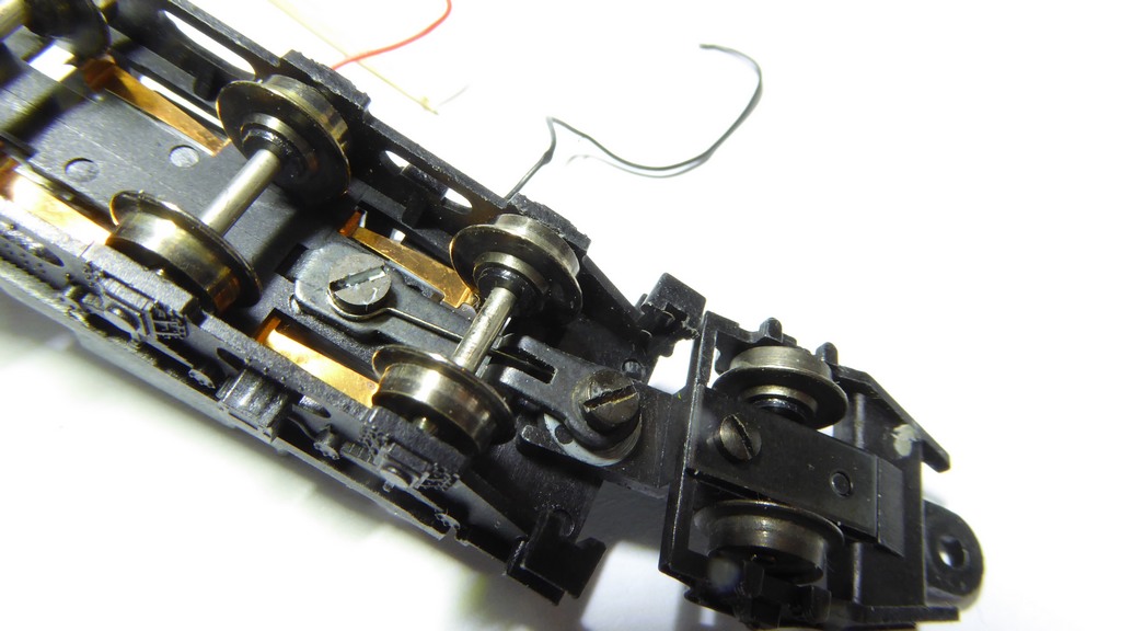 Turn the tender upside down. Note the position of the long spring beneath the screw that is between the front and centre axles. This is more tricky to replace if you are not aware of how it was fitted in the first place ! Remove the screw that holds the spring and thread the articulated draw bar from under the front axle. There is a lip at the end which needs to be lifted out of a slot. Keep the screw and the spring safe.