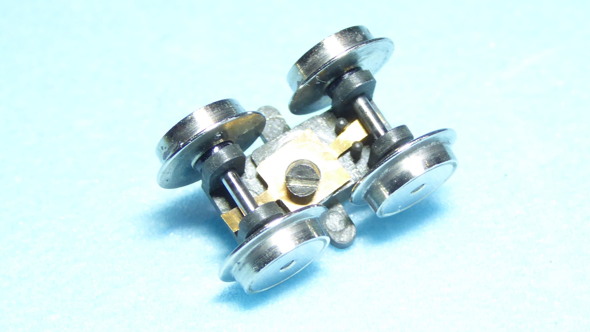 Both bogies are identical. This one will be used on the rear - it has a longer cheese head bolt with a head ground down to a smaller diameter. (The slot is off centre !). Note the wheels nearest the camera are not insulated. These wheel are connected to the positive rail on the right hand side of the loco. |