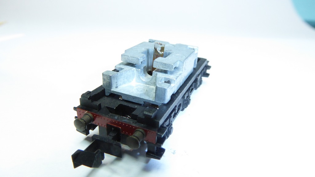This is where the electerical connection emerges from the positive pickup. We need the red wire attached to this. But it protrudes above the tender weight, and we need to be able to place the chip on top. Mark where the top of th weight it, and snip off just below it. |