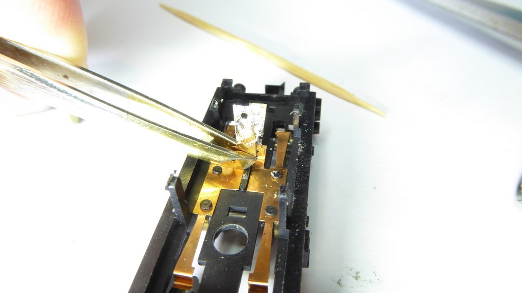 The same strip shown here without the weight. The tweezers are holding the strip prior to cleaning off the old solder and applying a thin layer of fresh. The tweezers will act as a heat sink to slow the transfer of heat to the plastic chassis. Beware catching the fragile stalks with the shaft of the iron. |
