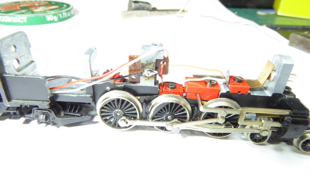 Alternatively, a brass or copper strip on the chassis under the motor can be fashioned. Ensure there is point where a wire can be soldered, and put a crease in it so that the motor will press down onto it to make a decent contact. Some versions of these locos had such a strip soldered to the negative motor terminal to connect it direct to the chassis. If so, this should have been removed and can be used for the black lead. Alternatively, when the motor is in position, wedge a bit of card under the motor to keep the strip in place. |