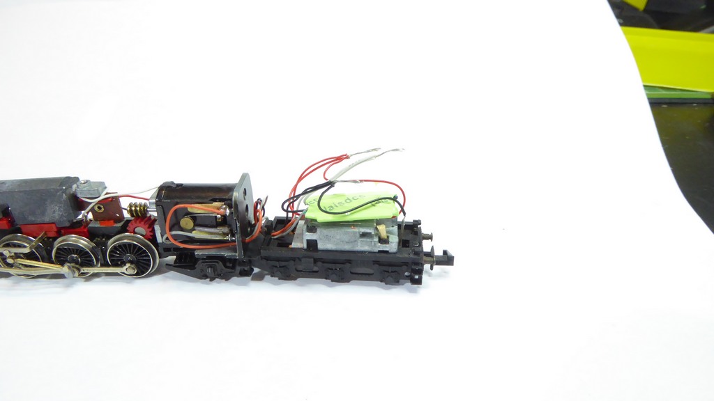 This photo shows the three groups of wires - red, black and white connected together. There are 3 red wires, all cut to an appropriate length, stripped, twisted together and left like that for now. Note the red wire from the tender pickup is looped in an S shape. The red wire from the chip is made as long as is possible. That leaves open the opportunity to redo the wiring if something goes wrong later in its life. The ride wire from the loco follows a similar route. The small loop between the loco and tender is checked before cutting to size. Something similar applies to the 3 black wires. There are only 2 white wires - one to the front of the loco and one from the chip. With the wires like this, the loco can be put onto the track and tested. |