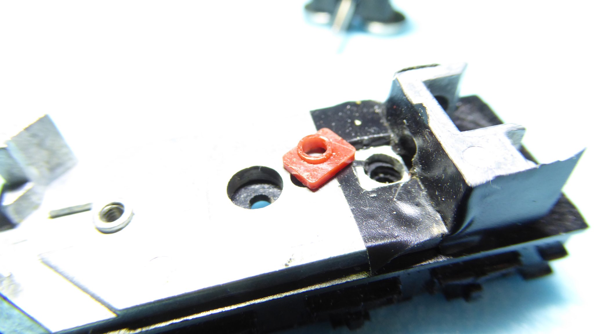 The lower tender weight in place. I have insulated it where the nut fits on top of the thread. What remains of the broken red insulation will be inserted into the rectangular recess. This will ensure that the bolt is kept central as it passes through the metal casting. |