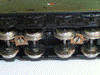 the bogie wheels on the track, the brass strip provides the