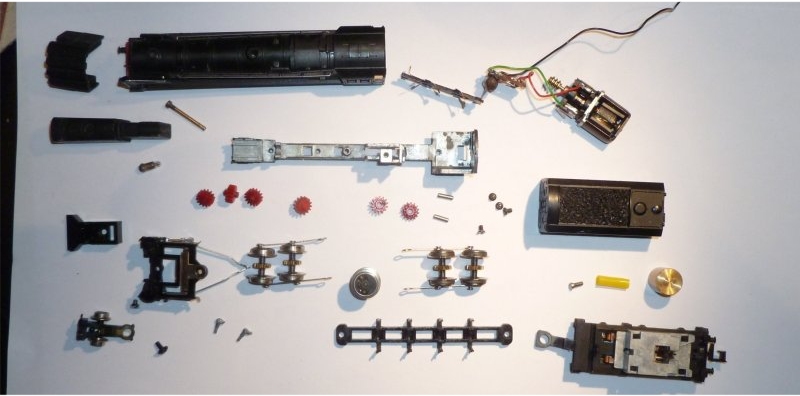 All of the bits spread out. I didn't desolder the motor - you can see these bits disconnected in the 'Motor' section. The eccentric valve rod is broken off and missing on both sides of this loco. I've even dismantled the tiny reduction gear and spindles from the motor housing (2 tiny plastic cogs). Note the plastic pins from the centre wheel which used to be attached to the eccentric valve gear. |